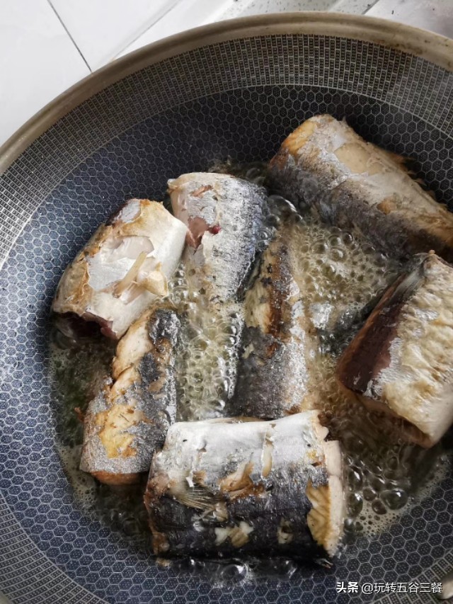 3.锅中倒入适量食用油,油温七成热时放入沙丁鱼,小火煎制,两面及时反转;