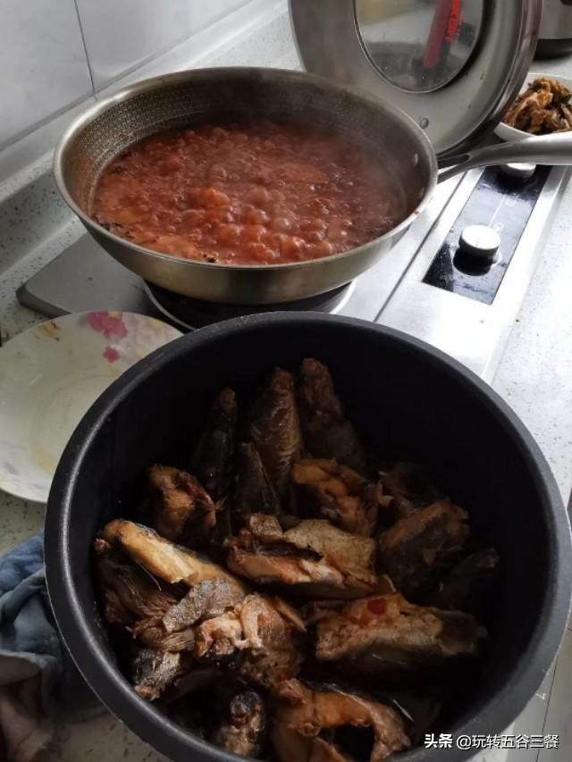 5,煎鱼剩下的一点点底油烧热,葱姜花椒,大料,香叶,桂皮下锅爆香放入番茄酱,盐,白糖(尝一下,这些调料自己家喜好调整量~喜欢甜的多加糖,喜欢咸的多加盐,喜欢酸的多加番茄酱)适量水烧开倒入高压锅浇在煎好的鱼上面,