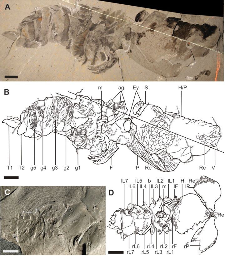 都昆虾是节肢动物的一个子群,身长超过10厘米。它们典型的特征是长有一对锋利的钳形下颚和一对大型前爪,钳形大嘴用于切割食物,分节的前爪用来抓取猎物,这是现代有颚亚门生物的典型特征,可能是螃蟹、蜈蚣等节肢动物的祖先。