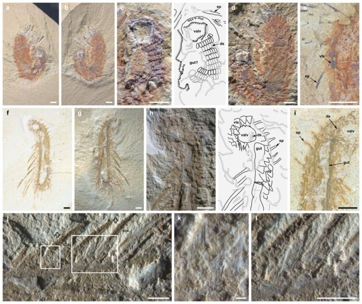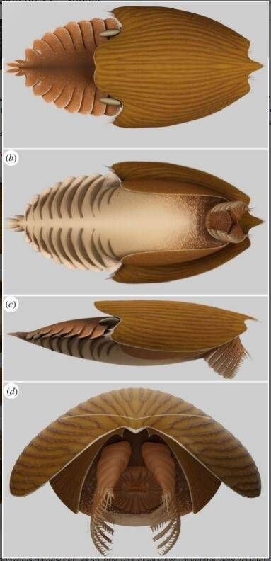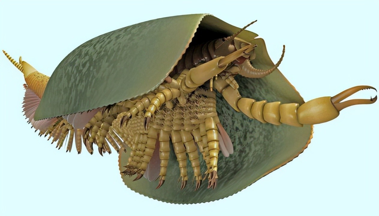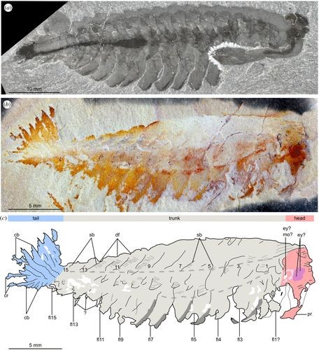 它们的身体由50多个节段组成,背部被宽大的两片式壳状背甲所覆盖,身体两侧具有叶足动物典型的可用于游泳又可用于呼吸的桨状附肢,身体下方还有许多分节的腿,让人联想到蜈蚣和千足虫。