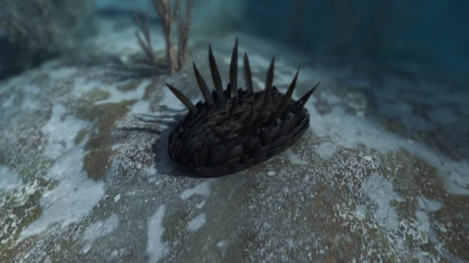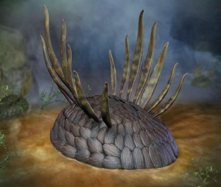 它们的奇异之处在于它们背部被层层叠叠的椭圆形的甲板覆盖,像极了古代将士的鳞甲。除此之外,它们背部长有两行叶形刺,刺的长度可到达5厘米。但是这些甲壳和刺并不是矿化骨骼,而是由碳基有机物聚合而成。
