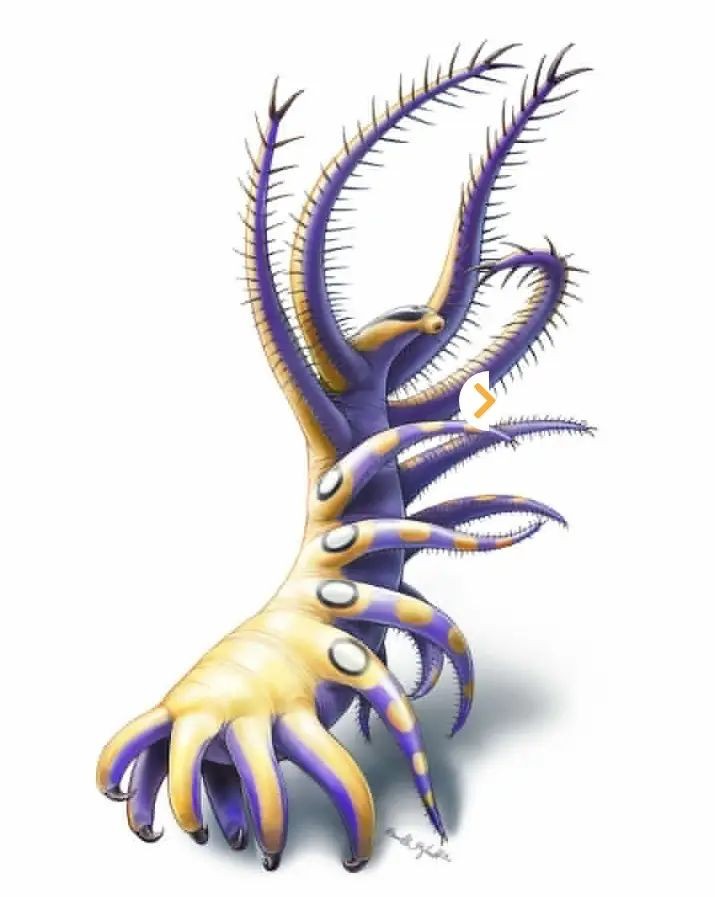 欧巴宾海蝎是寒武纪海洋的明星动物,身体总长度为40至70毫米。它们躯干细长,具有环节结构,身体中嵌有未矿化的外骨骼,背侧横向沟壑将身体分节,每个节段都有一对桨状附肢,用于呼吸,也用于游泳,尾部有多个尾叶组成尾扇。