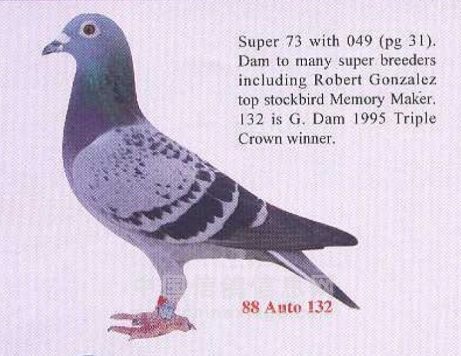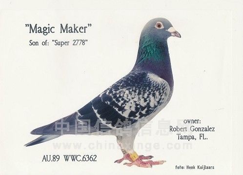 3)黄金制造者89-WWC-6253 “黄金制造者”。纯詹森鸽,育自凡得佛拉斯和詹森原舍。“魔术师”第一配对种母,育出太多顶级种鸽赛鸽,“年轻魔术师”、“纯魔术师”、“完美10”……的母亲。“美国小姐”、“雷克萨斯”、“HOCUS - POCUS”……的祖母。其子孙后裔在世界鸽坛连续发挥十几代。