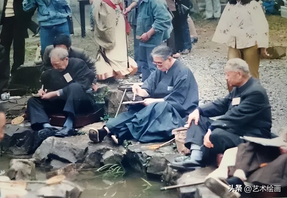 1987年,中日书法家共同参与的兰亭曲水之宴会,图中央三人左一为沙孟海