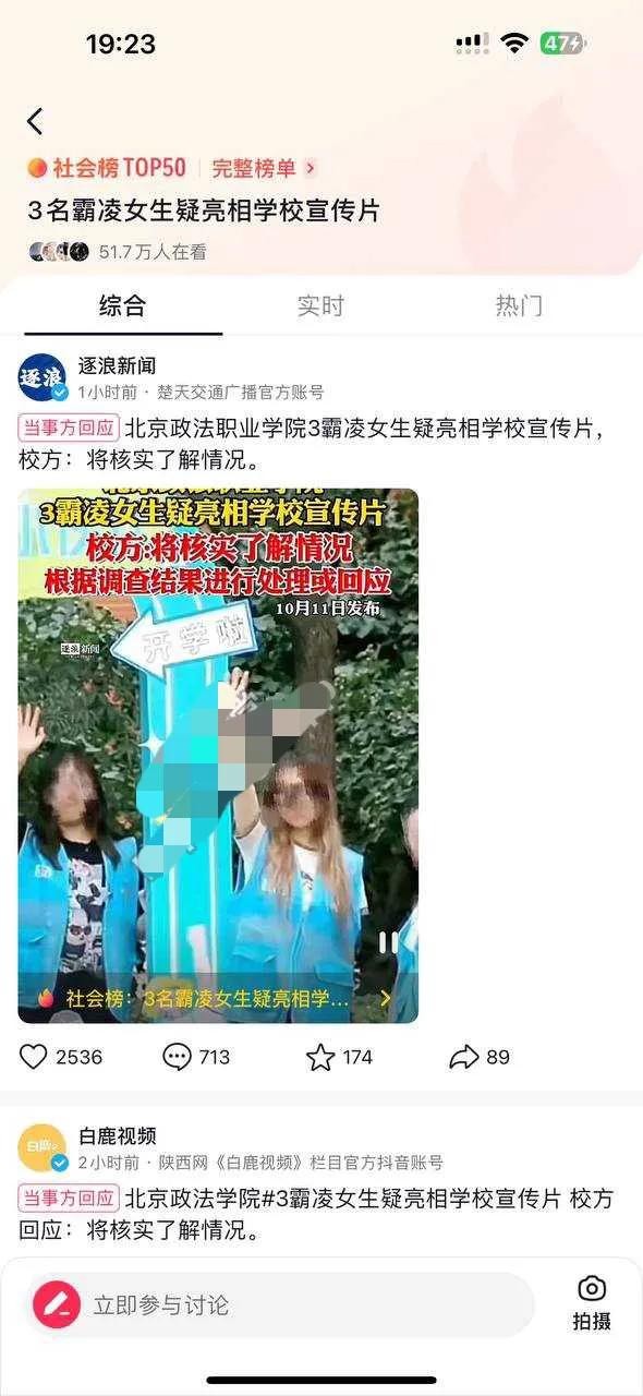 随着事件热度慢慢过去,该学校在今天招生季又发布了宣传视频,霸凌事件当事三个女生竟然出现在了其中。说明学业并未受影响,而之前得知的信息是制止霸凌的男生已然退学。简直粉刺,一个政法学院句能能做出这种事!于是网友对此进行了跟踪调侃。
