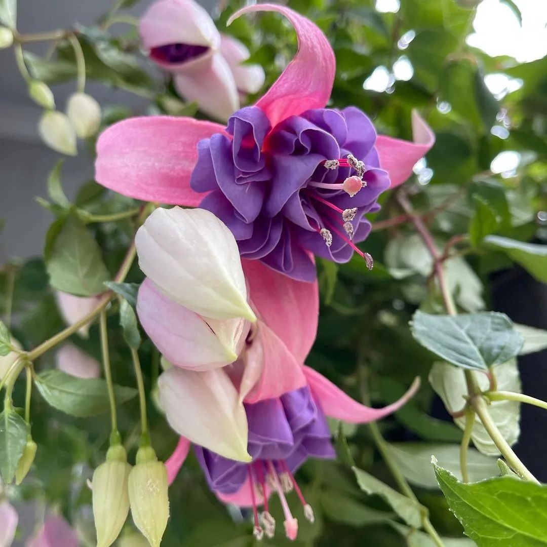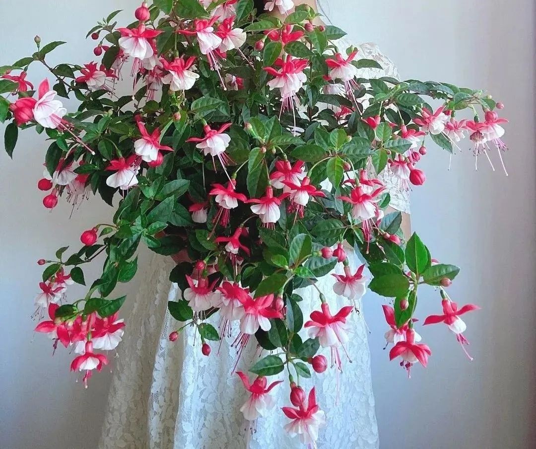 倒挂金钟原产秘鲁、智利、墨西哥等中南美洲国家。花梗细长,花朵下垂,花萼筒状似钟,开花时犹如一个个悬垂的彩色灯笼或金钟,随风飘荡,非常艳丽。