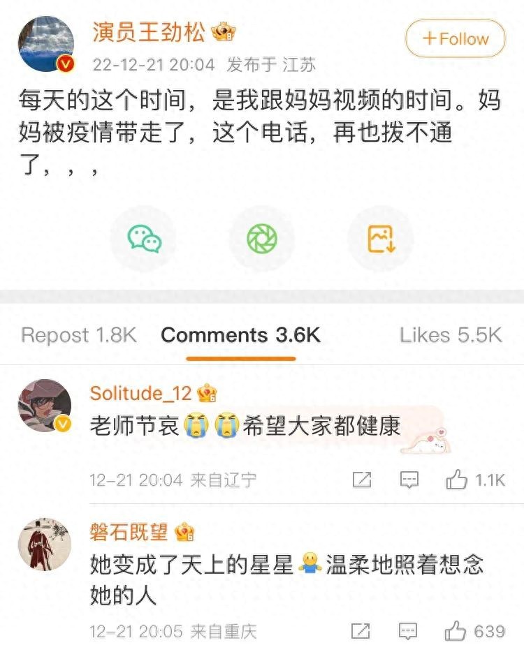 12月21日,知名老戏骨王劲松发文“每天的这个时间,是我跟妈妈视频的时间。妈妈被疫情带走了,这个电话,再也拨不通了”。