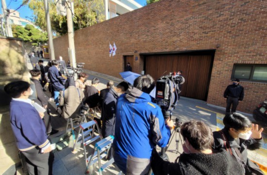 29日上午,大批记者聚集在李明博住宅前(韩联社)
