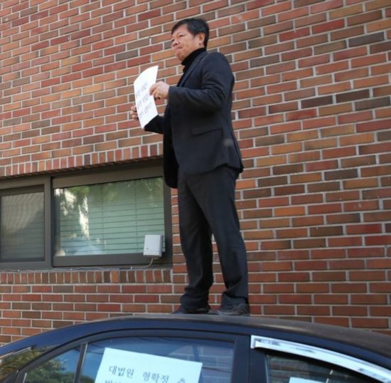 有男子在李明博住宅外示威,要求李明博谢罪(韩联社)