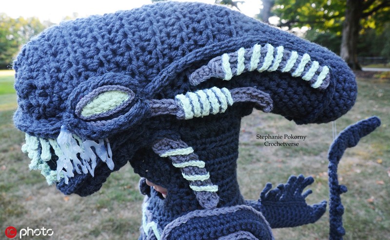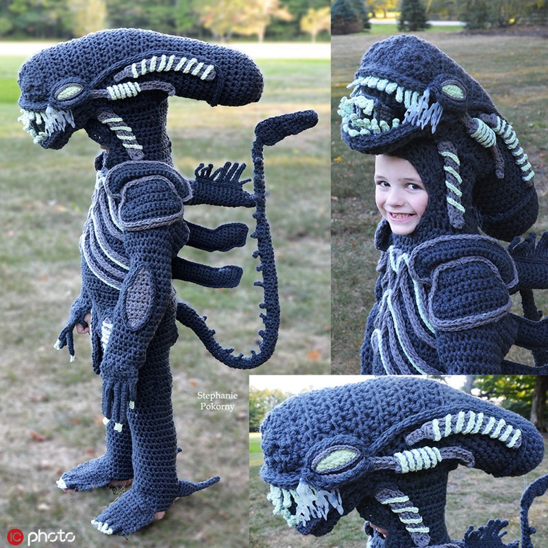 2019年10月7日报道(摄于10月2日),别闹了,这些服装赢了万圣节! 来自美国俄亥俄州的辣妈 Stephanie Pokorny 为她的孩子们创作了令人瞠目结舌的万圣节服装——全手工钩针完成。其中包括热门电影和电视中的角色,如《异形》、《捕食者》、《哈利-波特》,甚至斯蒂芬-金的《它》中令人毛骨悚然的小丑。