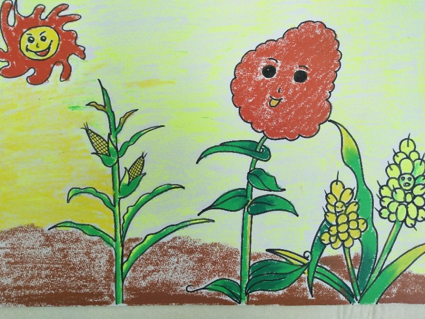 课前导入:亲爱的同学们,大家早上好,今天老师给大家带来的绘画作品是“大丰收”秋天到了,田野里的庄稼成熟了。黄澄澄的玉米露出了自己的牙齿,红扑扑的高粱像喝醉了酒的红脸大汉,金灿灿的麦粒在左右摇摆,请同学们想一想,还有那些农作物也成熟了呢?接下来,我们一起画画吧。