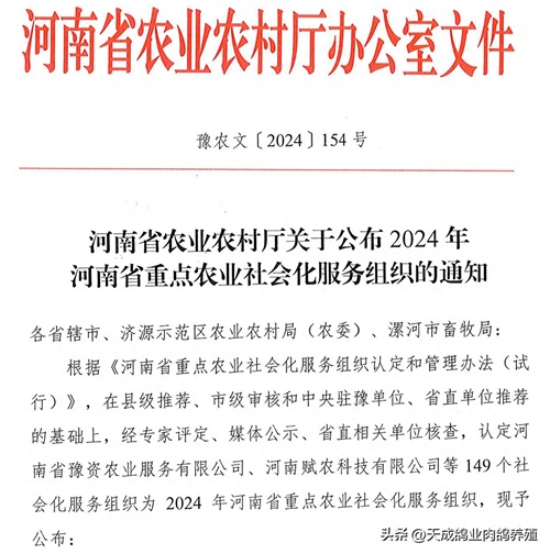 近日,河南省农业农村厅正式发布了2024年河南省重点农业社会化服务组织认定名单,河南天成鸽业有限公司凭借其在肉鸽养殖领域的卓越贡献和出色的社会化服务能力,成功获得这一殊荣。