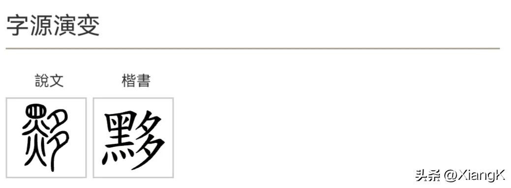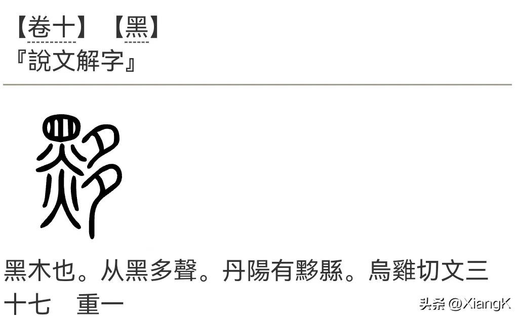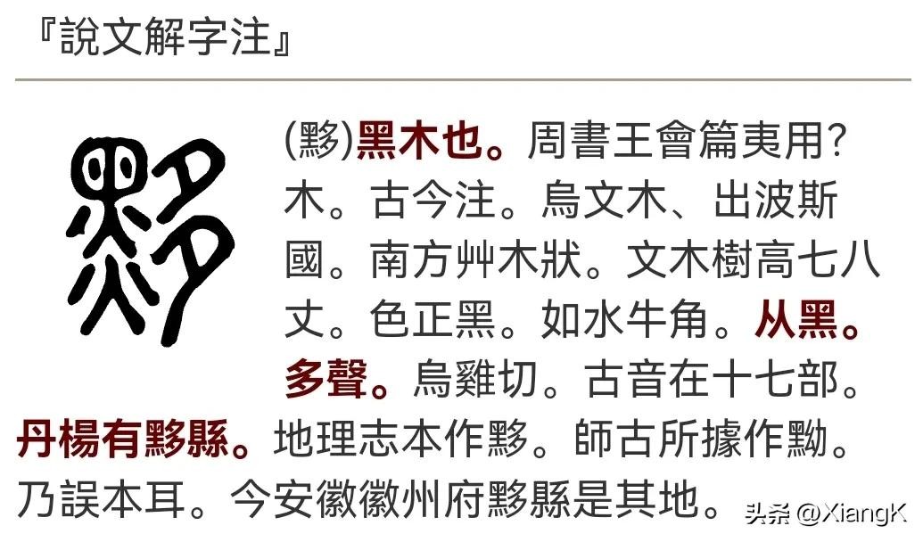 在《说文解字》中:黑木也。从黑多聲。丹陽有黟縣。烏雞切文三十七 重一