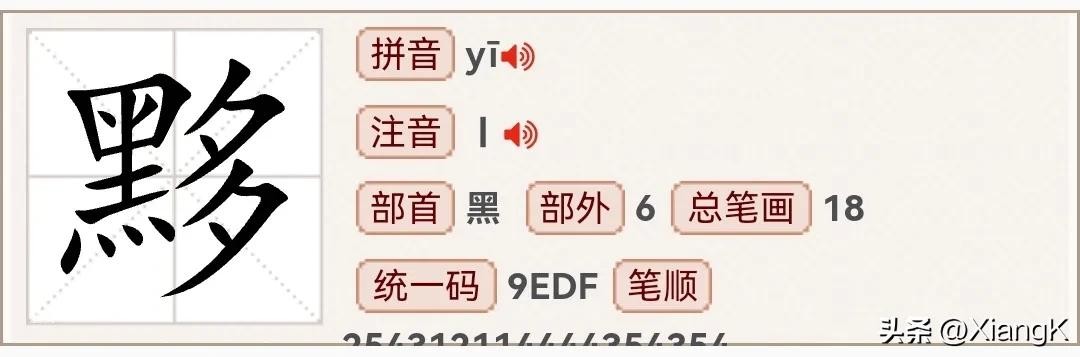 读音【yī】、同音字“依”、部首为黑、总笔画18、左右结构。