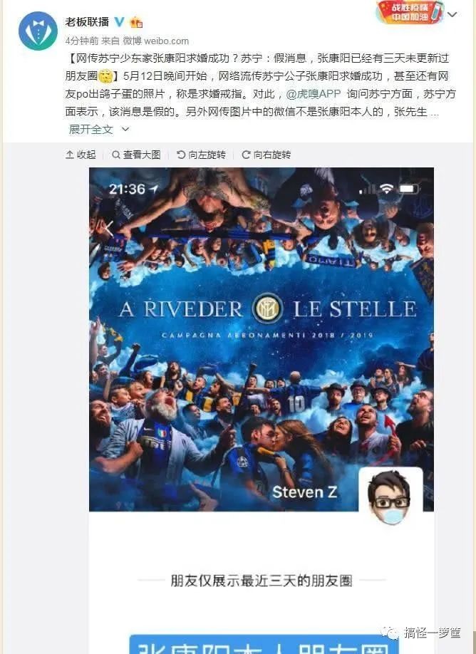 近日有博主爆料,国际米兰主席张康阳求婚成功,不过此消息随后立即被辟谣,苏宁方面表示,该消息是假的。不过,也有网友指出,万一人家张康阳发的消息是分组可见呢?总而言之,张康阳到底有没有女友?通过网络爆料来看,还真有一位女性是他的疑似女友。