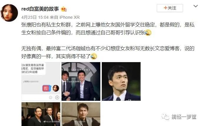 难道,这就能够证明张康阳的女友是她吗?显然证据还不够。有网友发布一个消息值得深思,这位博主爆料,“张康阳也有私生女粉群,之前网上爆他女友国外留学交往稳定,都是假的,是私生女粉按自己条件编的,而且想通过自己哥哥引荐认识张。”也就是说,很多所谓的CP,实际上是粉丝的YY,正常来看,张康阳这种又帅又有钱又低调又年轻的人,肯定是配谢其润这种又美又有钱又低调有年轻的人。但是,还真没谱。