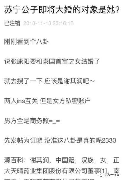 早在2018年,网络上就有一个大八卦,说张康阳即将与泰国首富孙女结婚,很快有人扒出来,这位女性是谢其润。2人被发现INS互关,女方是私密账户。谢其润是何许人也?她是张康阳大学时期的校友,胡润研究院在去年《2019胡润女企业家榜》上,郑翔玲、谢其润母女以440亿元人民币财富排名第7位。这位90后女富豪颜值爆表,被认为和张康阳门当户对。