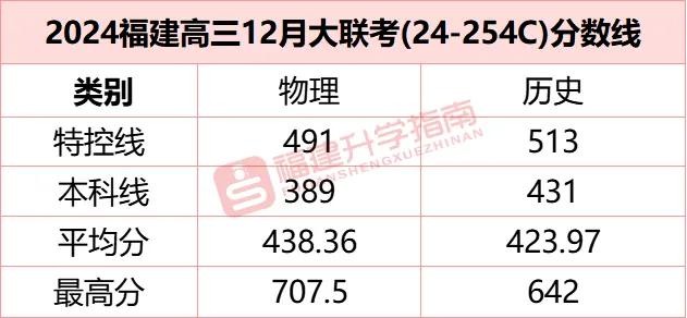 2024福建高三12月大联考(24-254C)分数线,其中物理特控线491分,历史特控线513分;物理本科线389分,历史本科线431分。