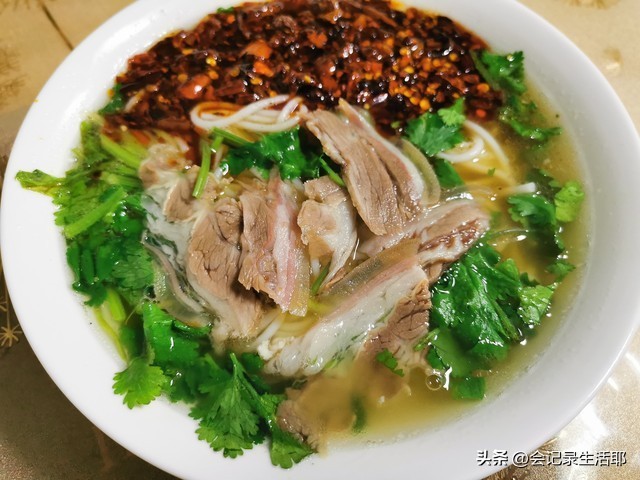 阆中牛肉面是四川南充的传统美食,它的独特之处就是冷面热吃,把煮好晾凉的面和豆芽放碗里,再放几块牛肉,然后盛了超大一勺酱汤淋上去,最后撒上一把香菜和韭菜,一碗热腾腾的牛肉面就做好了。吃起来面条裹满浓稠的酱料,汤味浓郁,非常好吃。