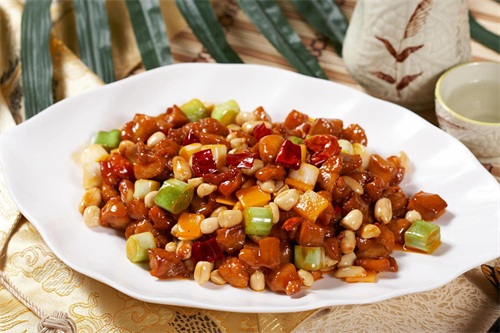 宫保鸡丁选用鸡肉为主料,佐以花生米、辣椒等辅料烹制而成;红而不辣、辣而不猛、香辣味浓、肉质滑脆;其入口鲜辣,鸡肉的鲜嫩可以配合花生的香脆。