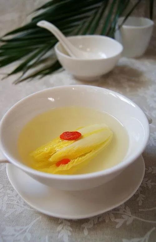 而白菜则要选取将熟未透的大白菜做原材,只选用当中发黄的嫩心,微焯之后用清水漂冷,去尽菜腥后再用“开水”状鸡汤淋浇至烫熟。烫过白菜的清汤当然要弃置不用,烫好的菜心垫入钵底,轻轻倒进新鲜的鸡汤,此菜才算成。成菜乍看清汤寡水,油星全无,但闻起来却香味扑鼻,吃在口中清鲜柔美,自胜过那万般佳肴。这道菜,由精选的白菜心和熬制的清汤制作而成,看似朴实无华,却尽显制汤功夫。成菜后,汤醇淡素雅,清澈见底;菜色泽嫩绿,形态艳丽,见之顿觉清鲜明快;嗅之雅香扑鼻;食之柔嫩化渣,鲜香异常。据说这道菜对南方广东这个地方,是非常受欢迎的一道菜,更适合南方广东人清淡的口味。