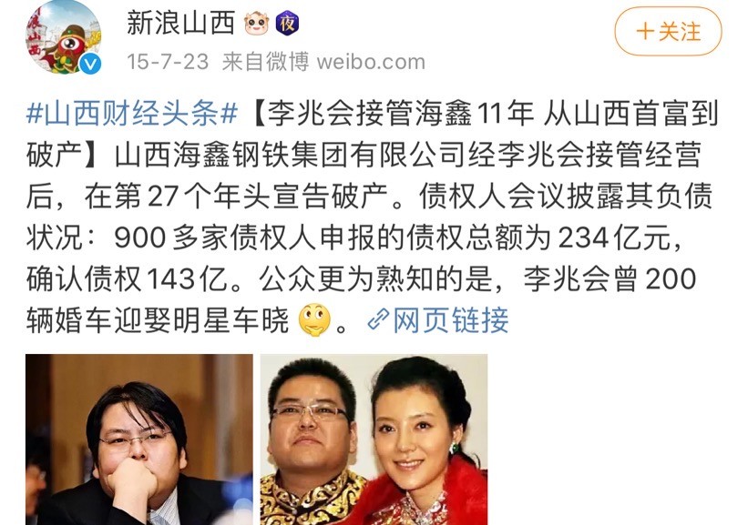 李兆会作为山西历史上最年轻的首富,曾经备受关注,随着海鑫钢铁集团的破产李兆会也逐渐走出人们的视野,而这次网友的曝光,再次将这位山西前首富推入大家视野,而演员嫁入豪门一直是娱乐圈最强话题之一,一时间也是引起无数网友热议