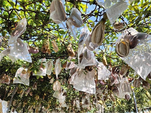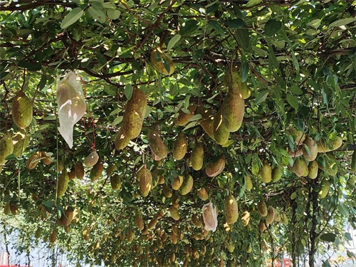 当天上午,记者来到果园,远远就看到架子上翠绿的藤蔓下挂满了肥硕的“八月炸”,有翠绿色、紫色、黄色的果实,有的已经裂口,露出洁白的果肉,散发出淡淡清香,让人垂涎欲滴。