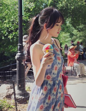 扎成高高的拢在发顶上的马尾辫,高扎马尾辫发型发尾的纤细感很能营造轻盈运动风的特色,阳光中的美少女造型,斜刘海是用来修饰脸型的,梳头发发尾比较有精致感。