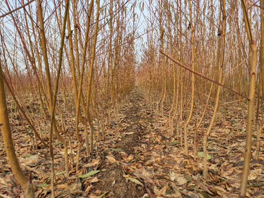 2、3月中旬开始定植,定植时按预计的株距行放线打点定植在垄中间。要求行直株匀,横、竖、斜成直线。株距2~3米为宜。栽植前,对有根瘤病风险的地块建议蘸K84保护,栽苗时要把选好的苗木置于穴中,将根系舒展开,嫁接口朝迎风方向,苗木扶正,然后填土,加土至根颈处,将苗木轻轻向上提一下,使根系与土充分密接,踏实,灌足水,待水渗下后覆土保墒,最后留足树盘或管理带,覆盖地膜或地布。注意栽植深度以原苗圃中起苗时土迹为度,深栽易患根腐。在已使用有机肥的情况下,不建议栽树时使用普通化肥,可以用2~4两控缓释肥,或5月新梢长到15厘米左右追施化肥1次。