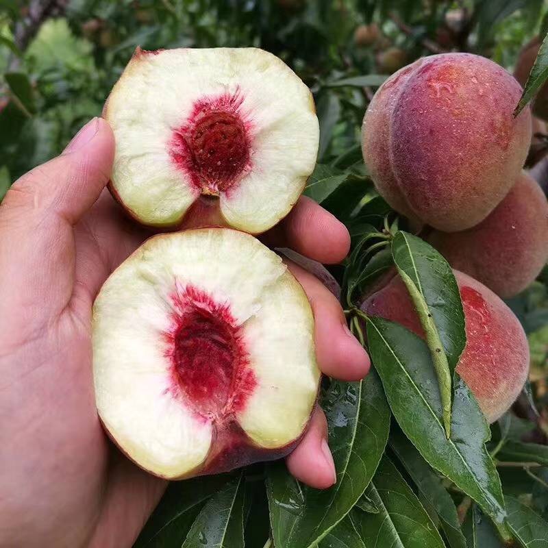 秋彤:美国品种,中秋节前成熟大果型离核桃, 成熟期8月中下旬到9月上旬,挂树到9月中旬还有果在树上,果重 250~550克,特大果可以达到1.8斤一个果,白肉离核,浓红,平顶圆形,浓甜味香,光洁稀毛,不用套袋,成花快,花粉多,极丰产。