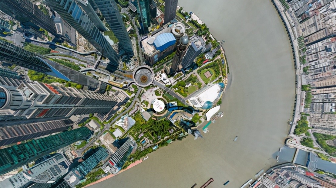这张图片从230米高的东方明珠塔上拍摄,提供了一个360度的上海全景,用户可以平移和放大,因此即使是地面上的人和物体也能被识别。