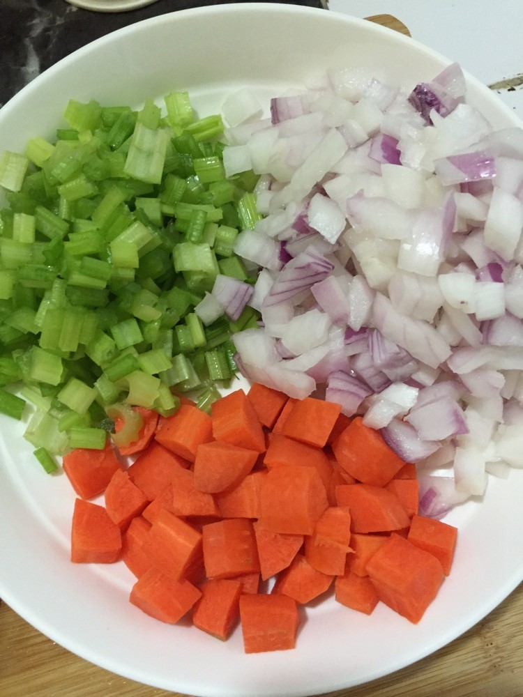 2西芹,洋葱,胡萝卜,西红柿切块放烤箱烤上色。