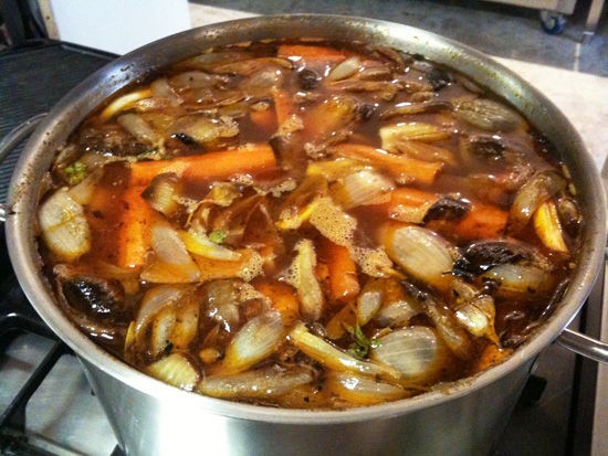 4把牛骨头,烤好的蔬菜倒入锅里,加水,番茄膏,红酒,黑胡椒,迷迭香,煮八个小时。