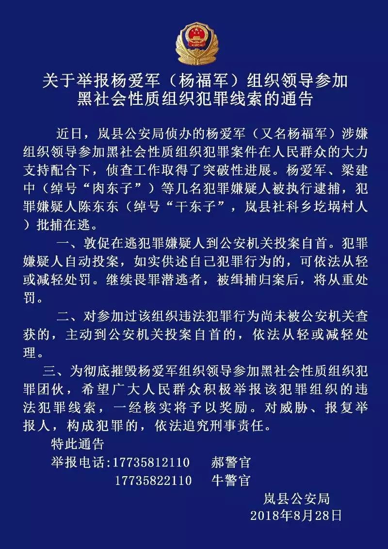 「扫黑除恶」关于举报杨爱军(杨福军)组织领导参加黑社会性质组织犯罪线索的通告