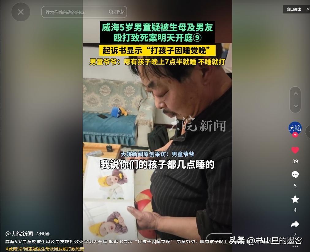 大皖新闻——2025-03-24《威海5岁男童疑被生母及男友殴打致死案明天开庭 起诉书显示“打孩子因睡觉晚” 男童爷爷:哪有孩子晚上7点半就睡,不睡就打》