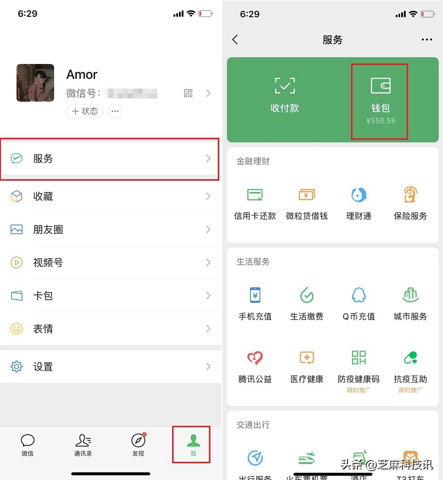 1、在手机中打开微信,然后依次点击“我”-“服务”“钱包”选项,如图所示。