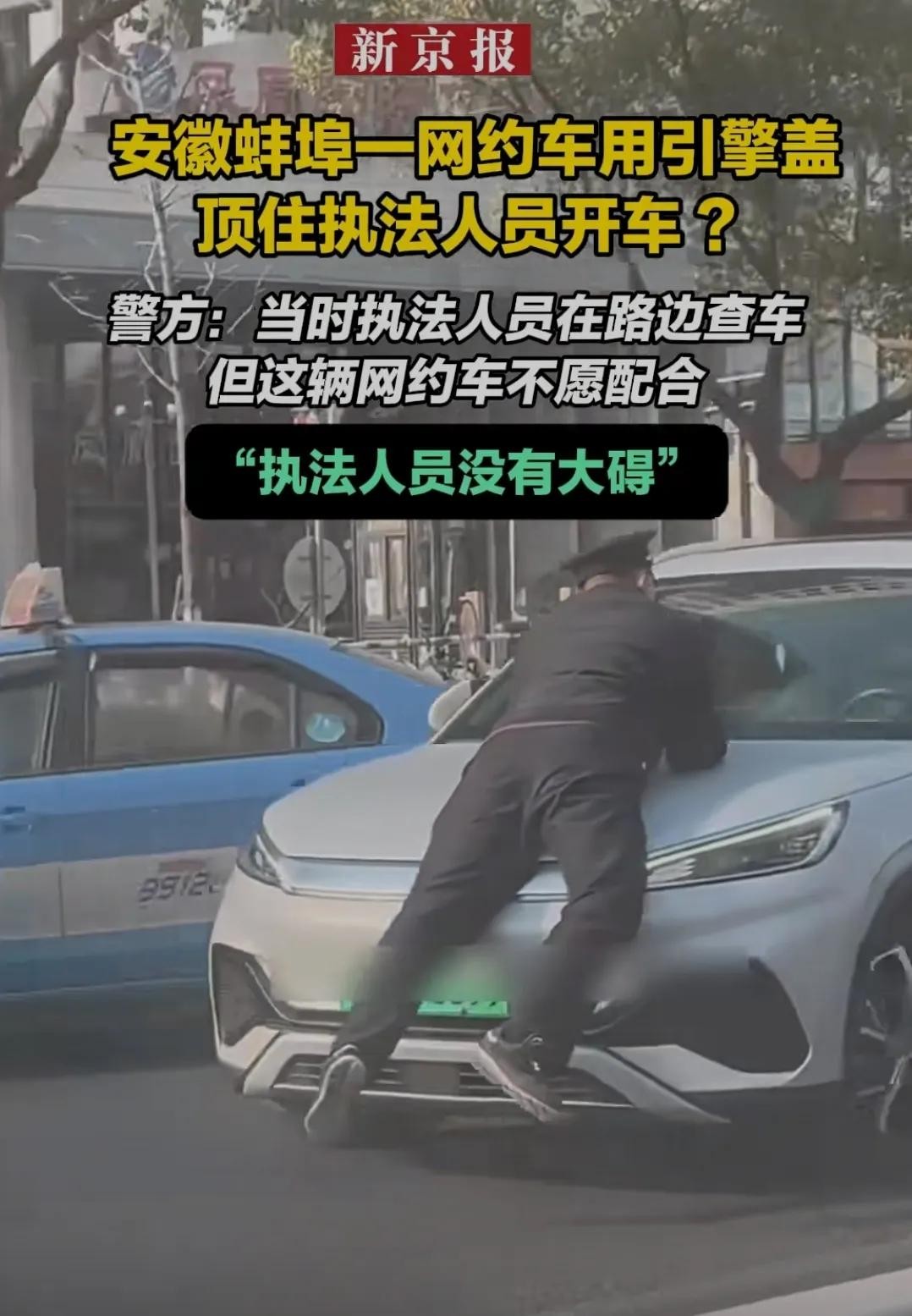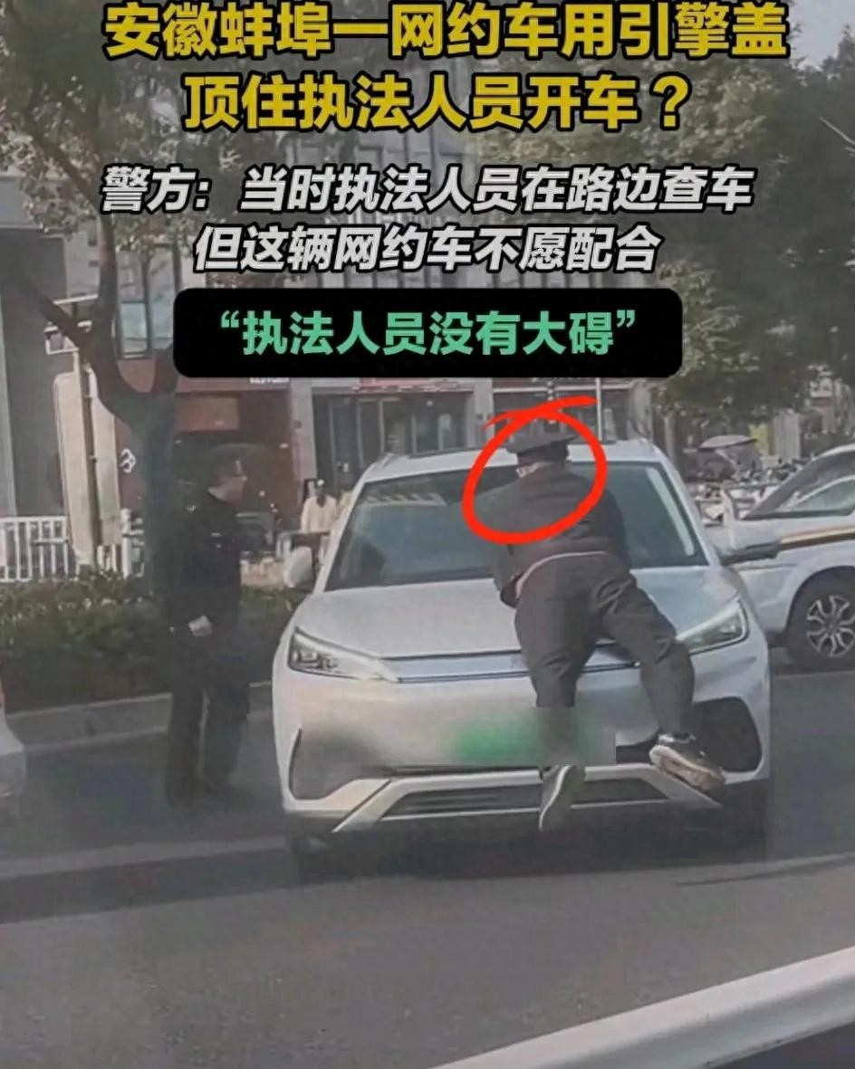 执法人员趴在引擎盖上被顶行!警方回应:网约车不配合检查。