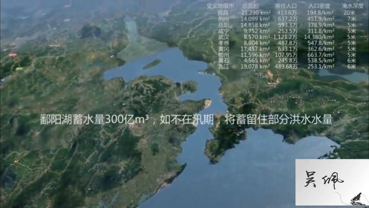 ·三峡至九江沿江长度1000km,溃坝15小时后洪峰到达九江。由于九江境内湖泊众多、紧邻鄱阳湖,加之背靠群山,如在汛期,九江城区淹水将达7米以上,并很难退去。鄱阳湖蓄水量300亿m3,如不在汛期,将蓄留住部分洪水水量。