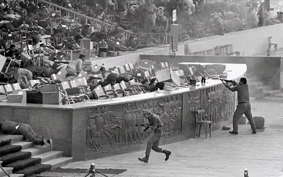 萨达特在主席台上也看到了这个情况,看见三个士兵从车上跳下来,还以为他们是要下车行持枪礼,于是站起来朝他们挥手致意。