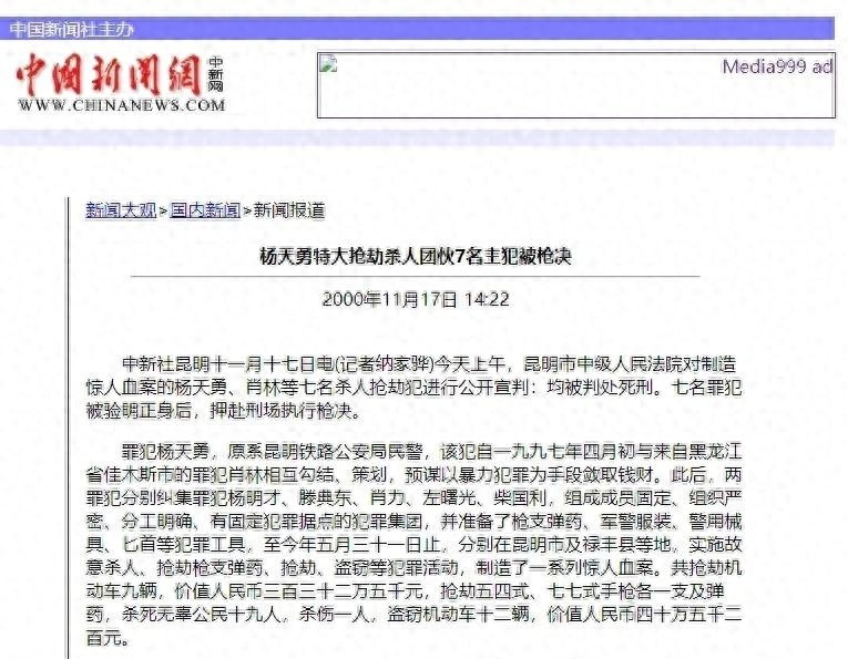 杨天勇,原本是昆明铁路局公安分局东站派出所的一名干警,曾在部队服役三年并精通射击。,这位警察却走上了犯罪的道路,成为那个时期最臭名昭著的罪犯之一。从1997年4月至2000年5月,以杨天勇为首的8人团伙,在短短三年间实施了25起恶性犯罪活动,共造成19人死亡,包括3名警察、3名联防队员、1名现役军人及2名女性。这些罪行手法极其残忍,给受害者家庭带来了无法弥补的伤痛。