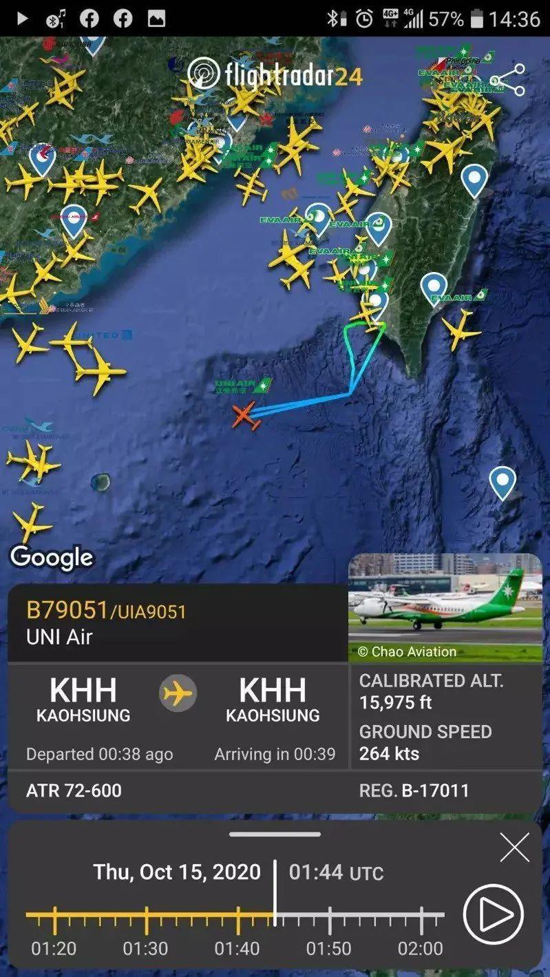 今天的立荣9501航班,可见到在飞往东沙途中,突然180度折返。图源:联合新闻网截自Flightradar24