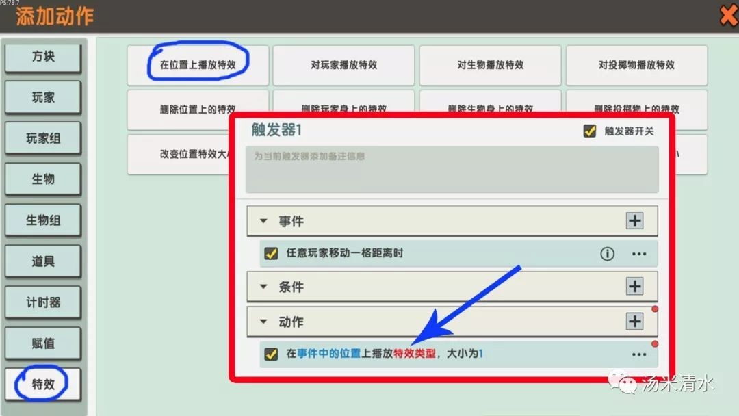 再点击动作后的“+“添加动作,拉到最下方点击特效→在位置上播放特效,随之动作下方出现(在事件中的位置上播放特效类型,大小为1)。
