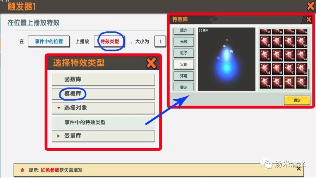 再点击“事件中的位置上播放特效类型,大小为1“这一行进行编辑,点击红色字样的特效类型→模板库,在特效库中选择你想要的特效后确定回→返回→转换玩法地图。