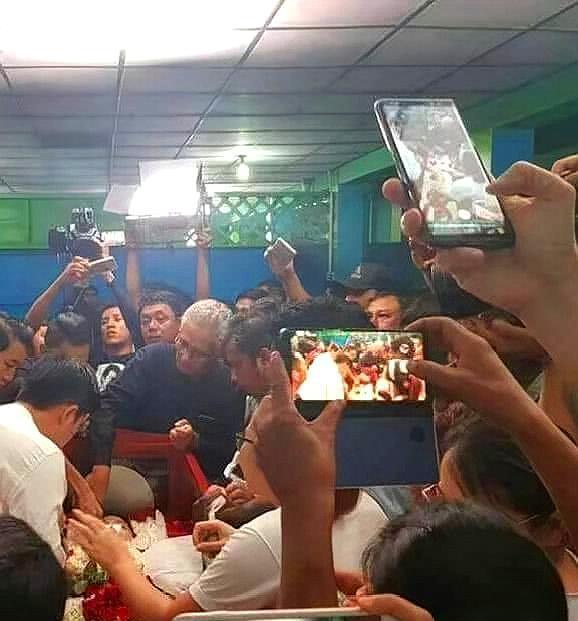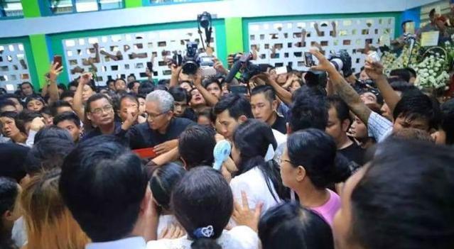据了解,就在葬礼的前一天晚上,已经有很多粉丝守在仰光耶威墓地了,就在葬礼举行的那天早上,当他的遗体被从冷藏室运出来的时候,有很多粉丝掏出自己的手机,纷纷对着遗体拍照。这还不算完,每当有明星从里面出来的时候,人群中就有大量的粉丝呼喊自己偶像的名字,硬生生的把追悼会变成了追星会。