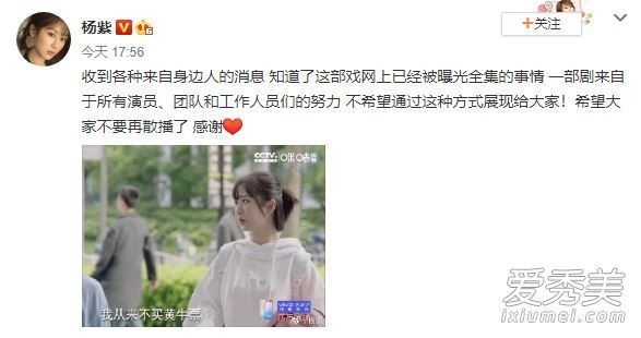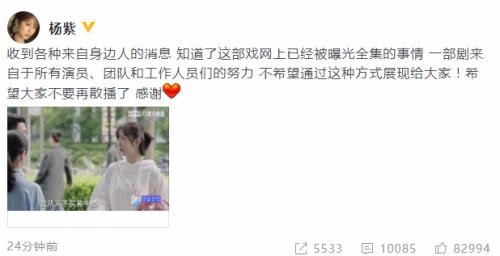 据悉,近日,有网友在微博曝出了由杨紫、李现主演的热播剧《亲爱的,热爱的》全集信息,引发热议。7月22日,杨紫发文称:“收到各种来自身边人的消息,知道了这部戏网上已经被曝光全集的事情,一部剧来自于所有演员、团队和工作人员们的努力,不希望通过这种方式展现给大家!希望大家不要再散播了,感谢。”