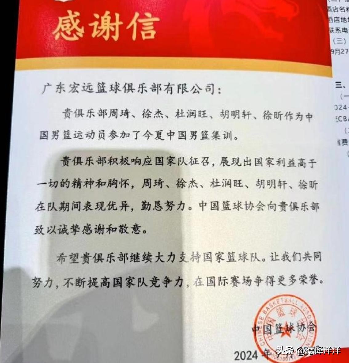 因为中国男篮贯穿整个暑假的集训极大地影响了各个CBA俱乐部的备战工作,所以中国篮协今天开会对各队进行了表彰,其中,浙江男篮和广东男篮都得到了一封感谢信。