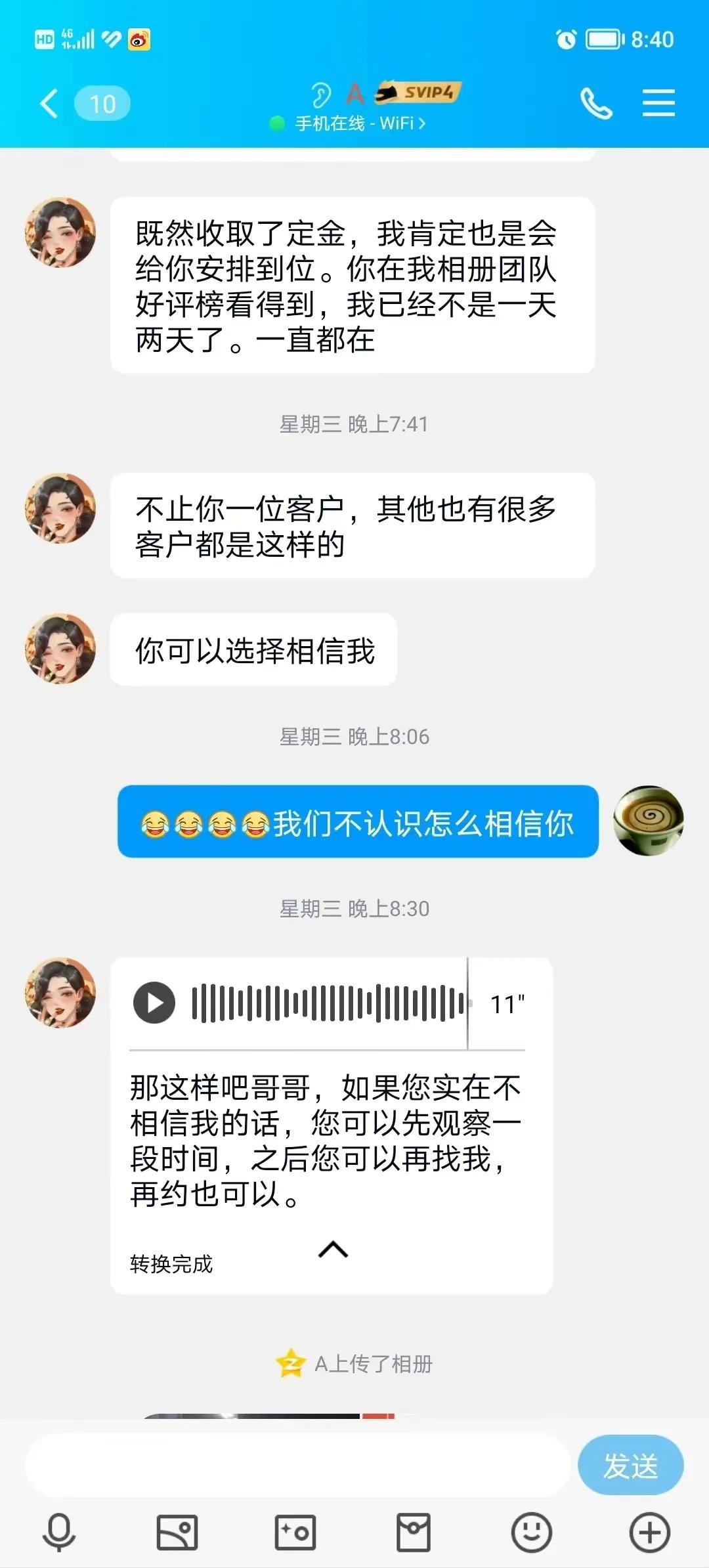 对方很快就通过,跟他聊了起来,并且表示卡片上就是服务人员,全都是真实的。