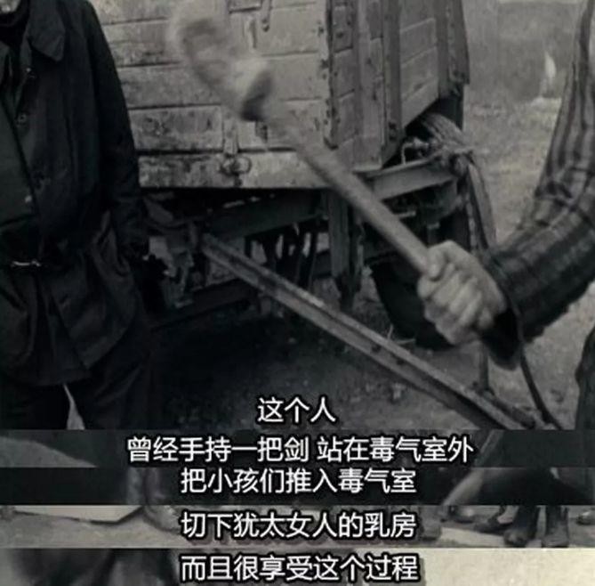 他经常挥舞着他的那把剑,朝着毒气室外的犹太人肆意挥砍,砍下他们的鼻子、耳朵,然后,把他们推进去,启动机器,成规模地杀死他们——
