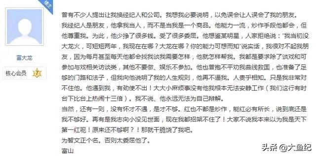 富大龙之前就在自己的贴吧里吐露过心声:不是他的经纪人捧不红他,而是他要求除了谈戏和可参加与戏相关访谈类,其他不要做、娱乐不参加。
