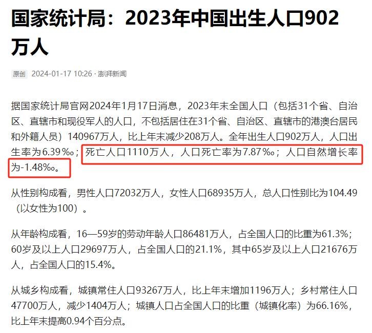 这标志着中国人口继续负增长,去年减少了85万人,今年更是减少了208万人。